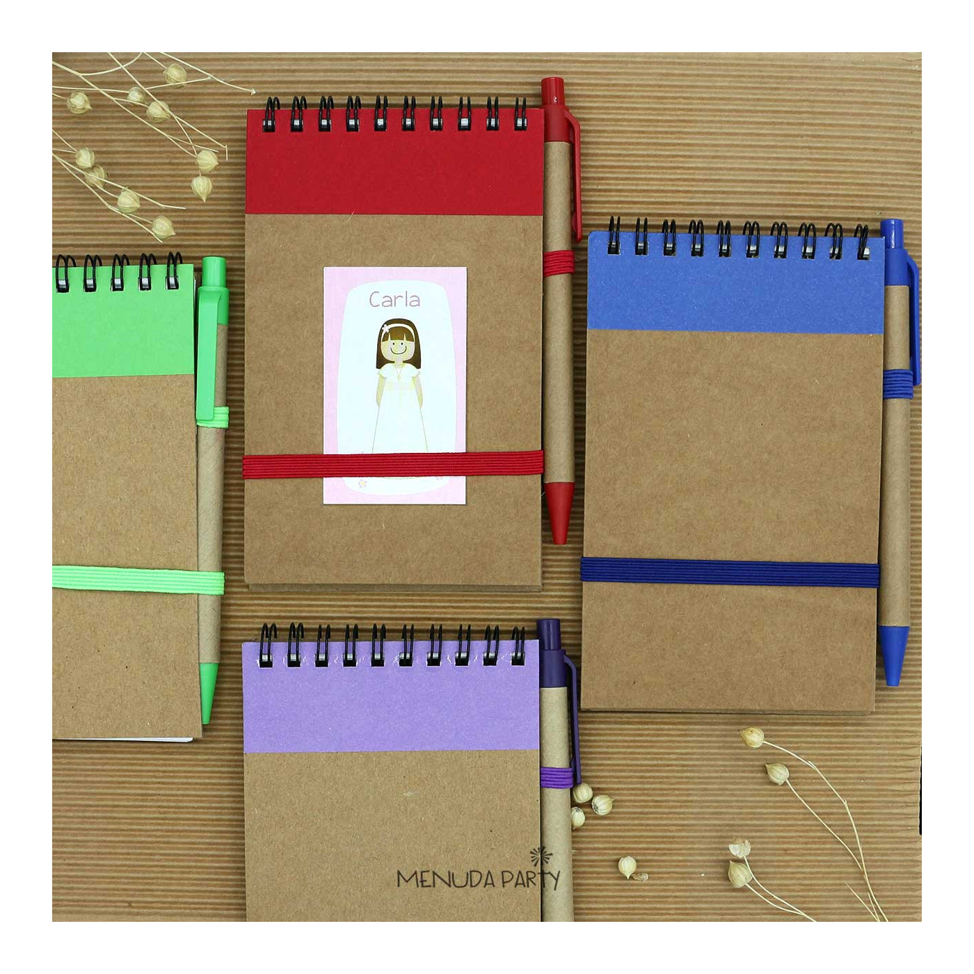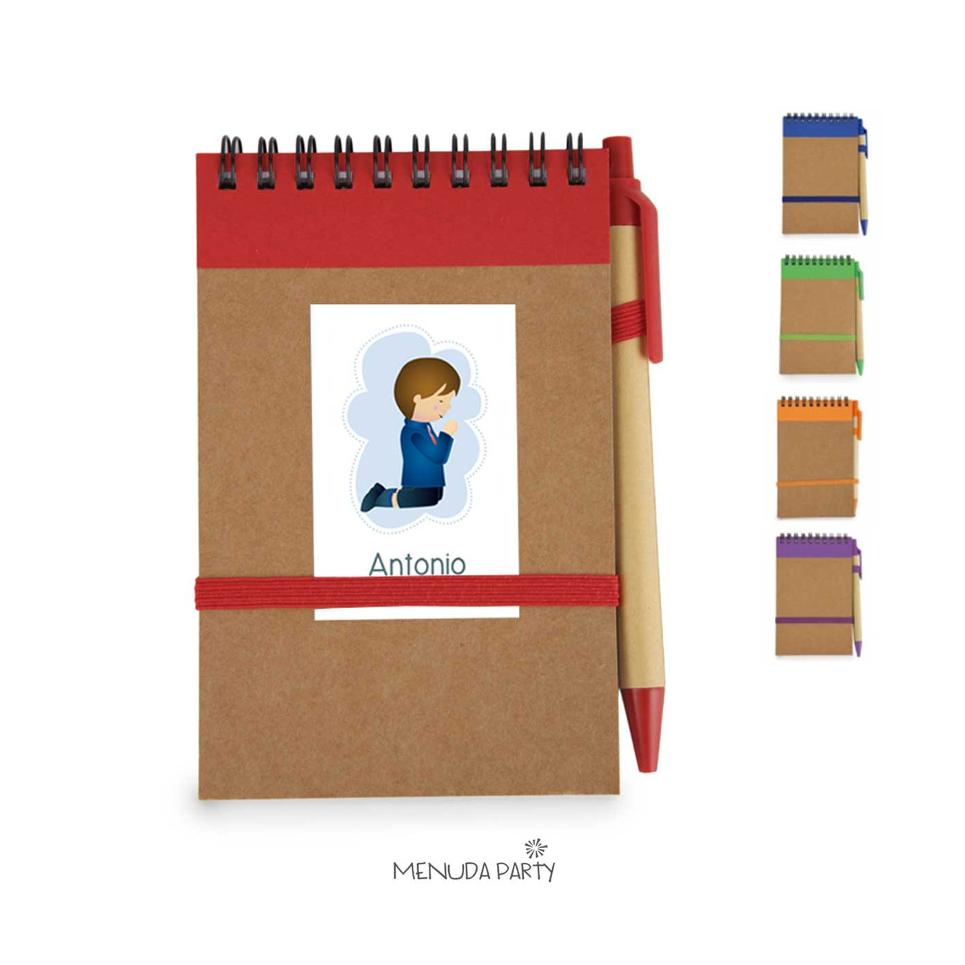 Libreta reciclada con bolígrafo. Tamaño 9x14cms con pegatina personalizada a juego con e l recordatorio. Viene en bolsita transparente individual.