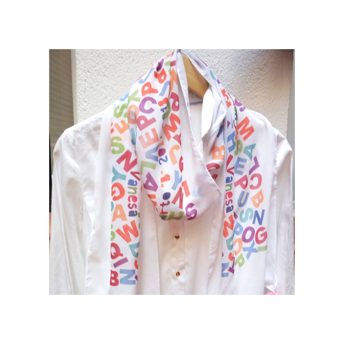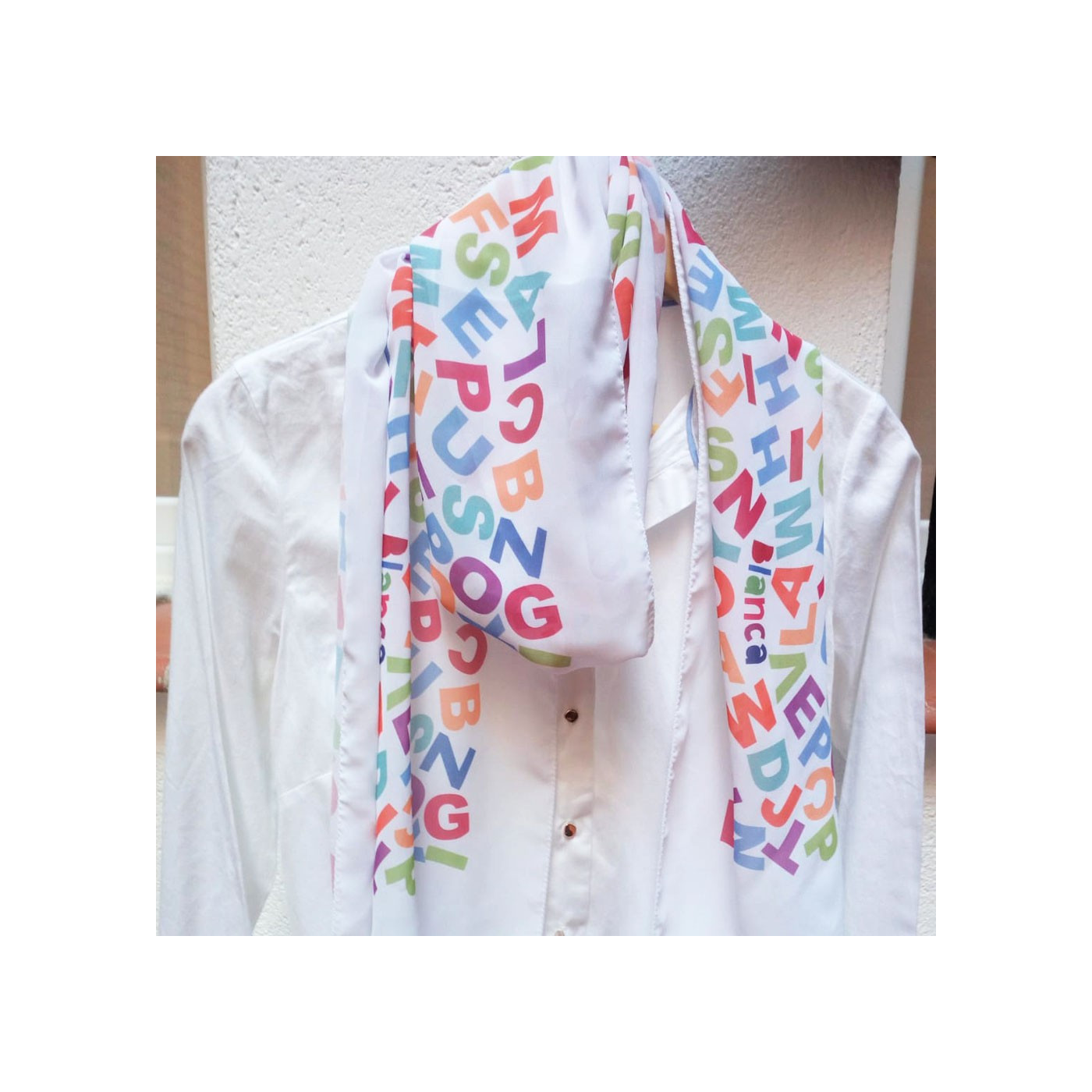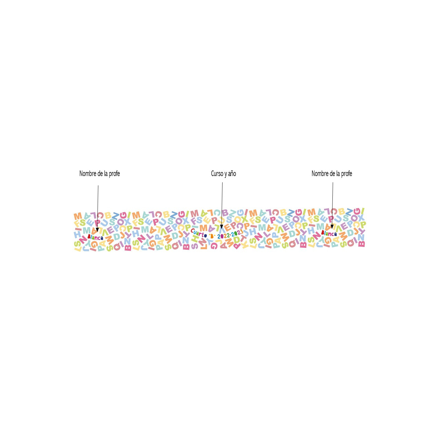Divertido fular con las letras y personalizado con el nombre de la profe y el curso.