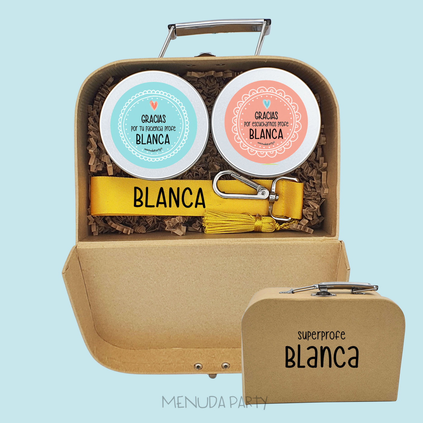 Curiosa maletita de cartón reciclado que contiene dos tarritos PET con chuches variadas (las chuches serán en función de existencias del momento) y un llavero hecho a mano personalizado. La maletita va personalizada.