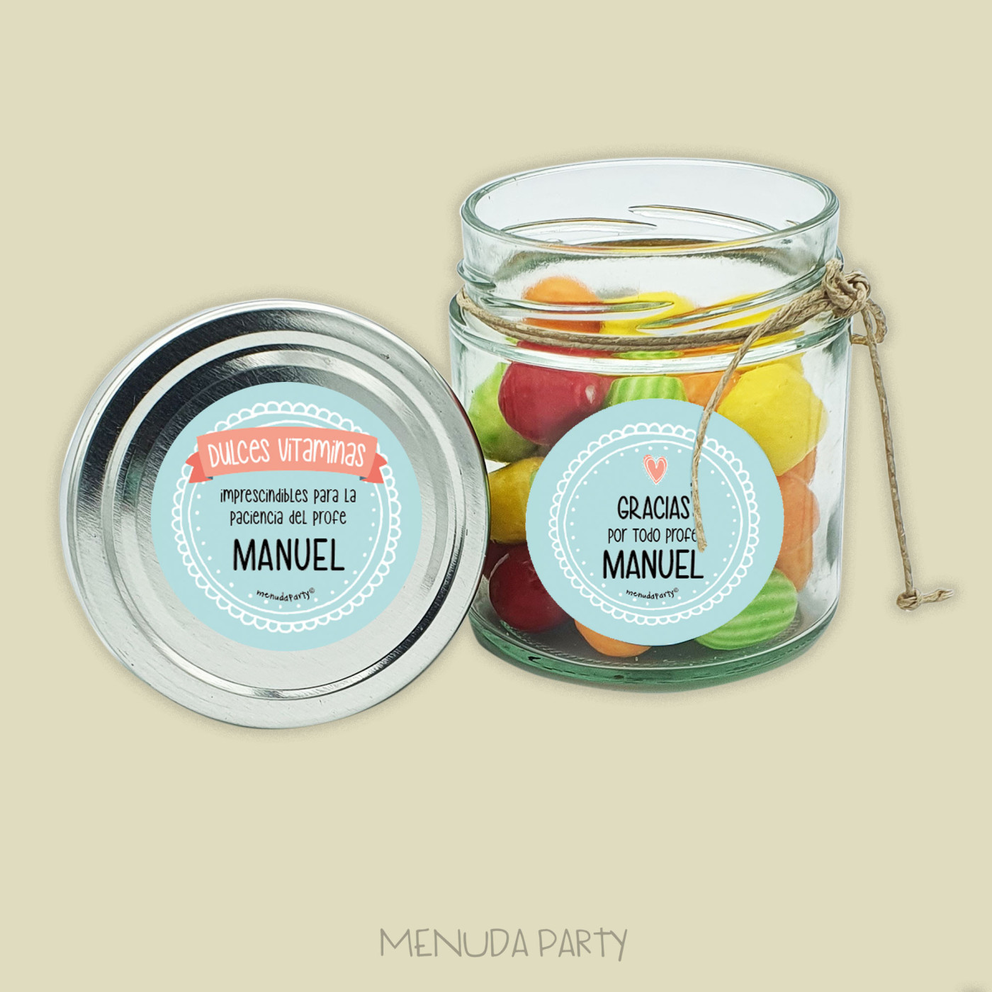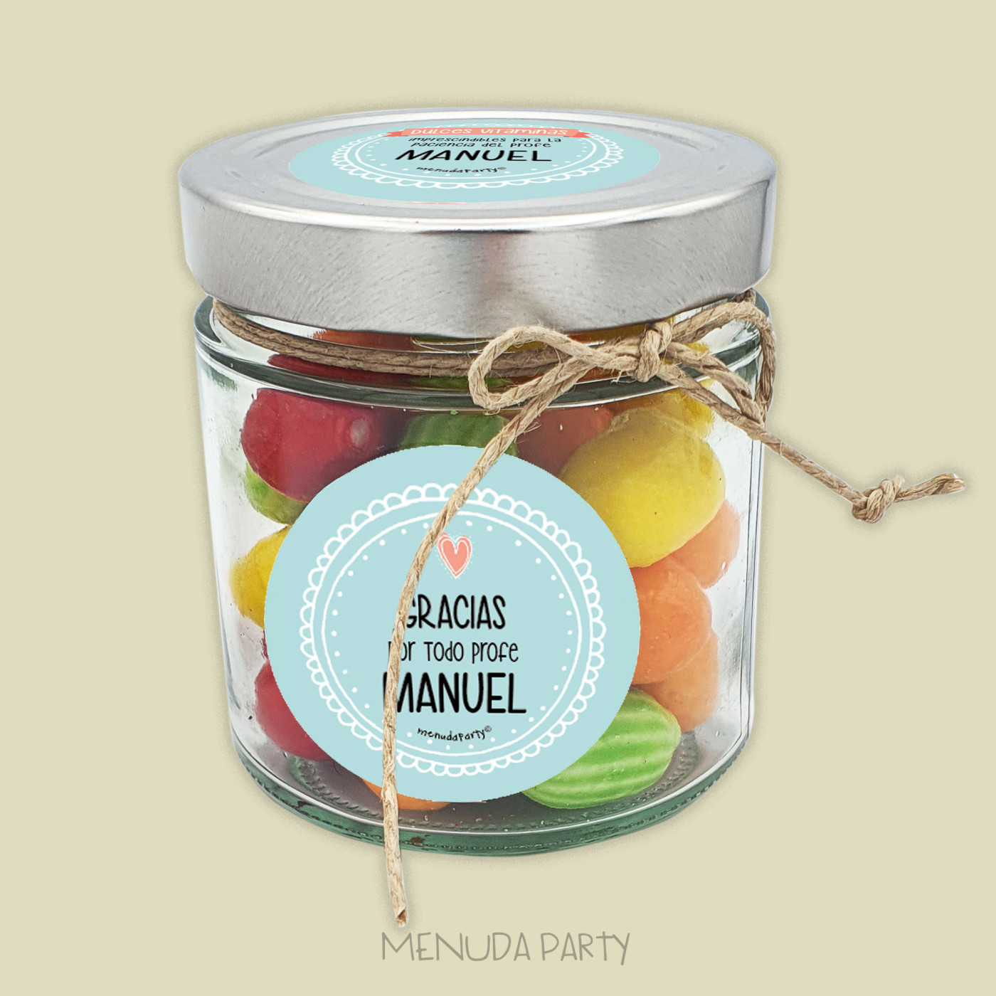 ¿Quieres un detalle para los profes??? Este frasco de cristal lleno de chicles con forma de frutas y personalizado puede ser un divertido detalle de agradecimiento para los profes.