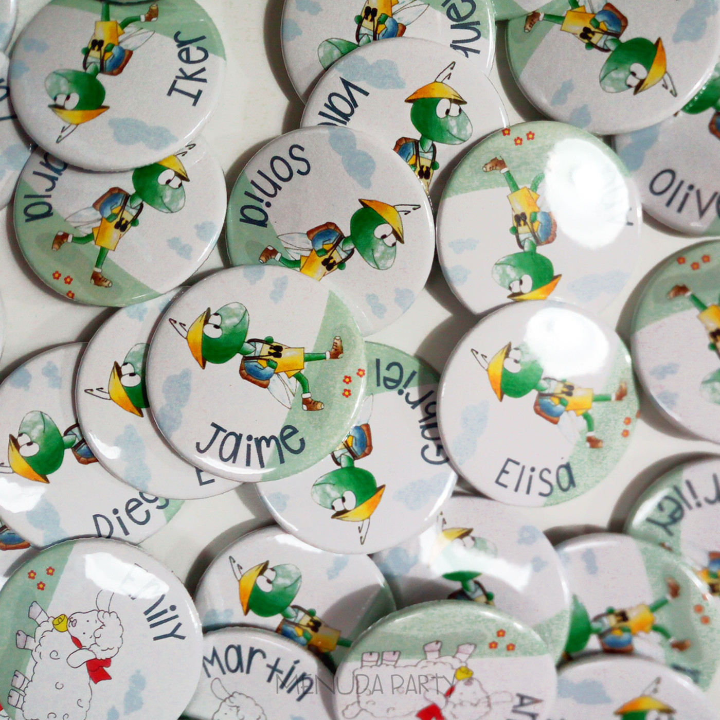 Chapita de 38mm que viene con cartoncito. La chapita viene personalizada cada una con los nombres de los alumnos/as de la clase.
